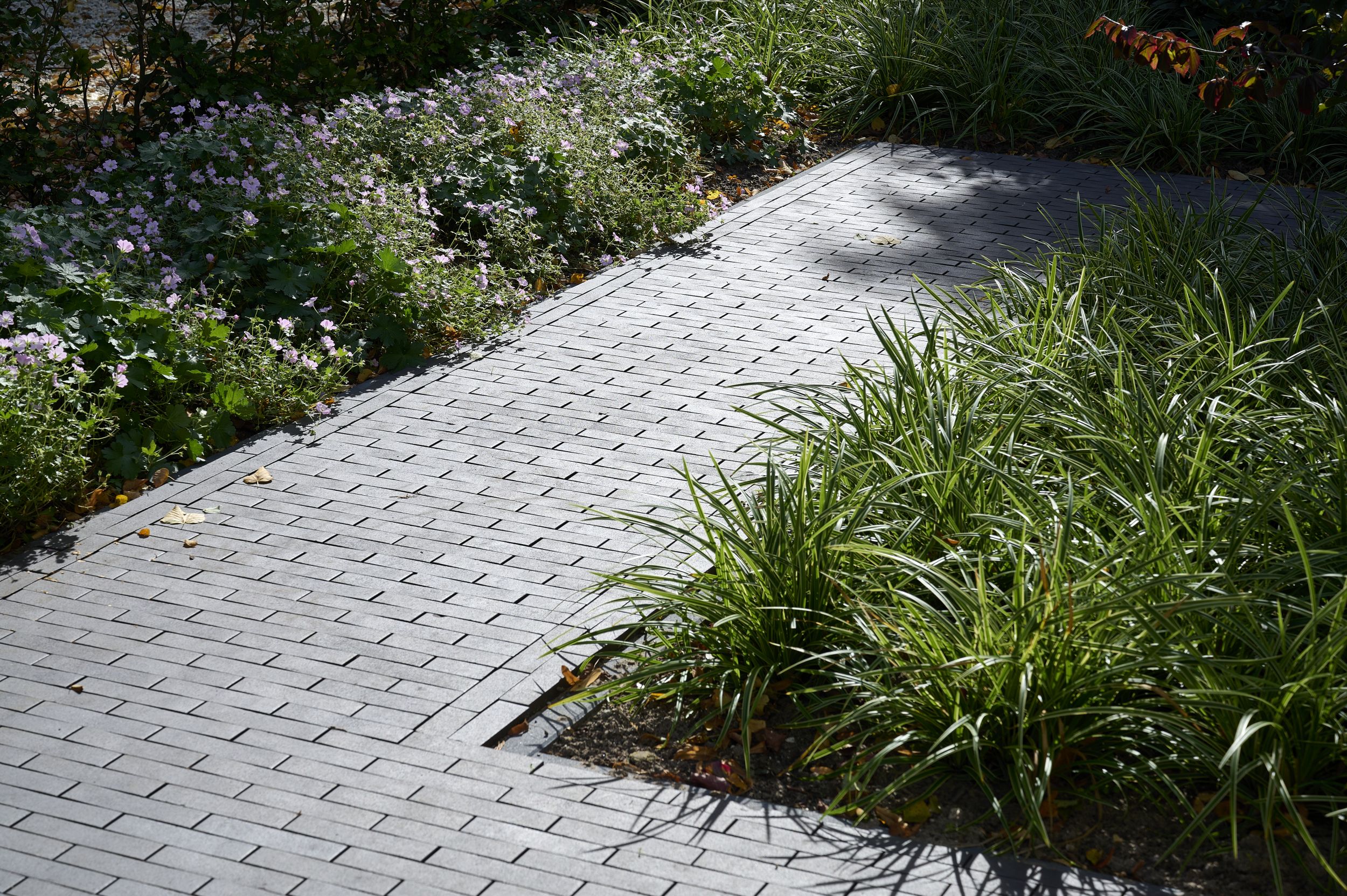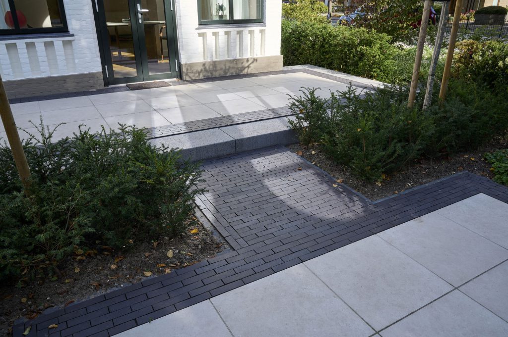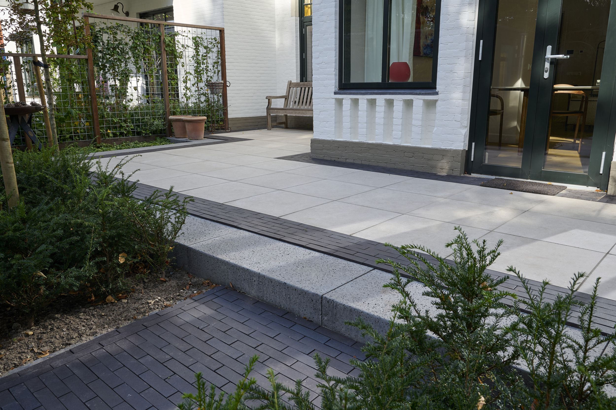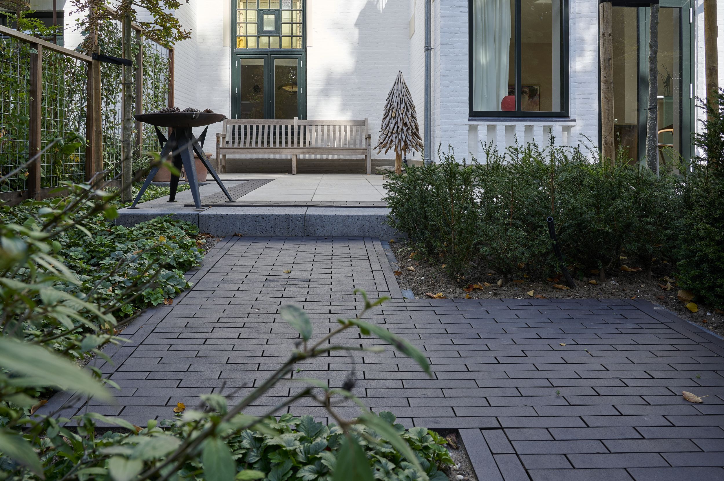 We kozen voor een combinatie van keramische tegels en gebakken waaltjes. Dit geeft een speels en charmant effect. De wandelpaden nemen je mee door de tuin. Er is gekozen voor een goede verhouding tussen groen en sierbestrating. Zo ontstaat er een goede harmonie in de tuin.