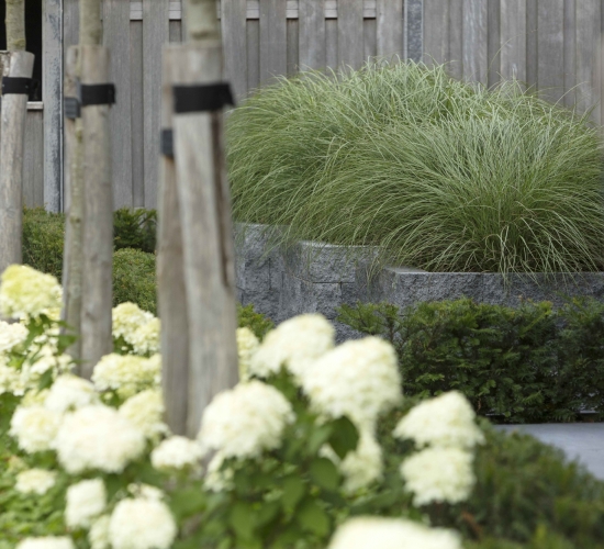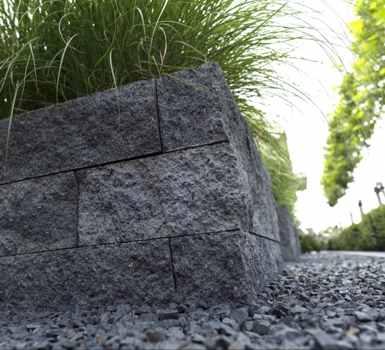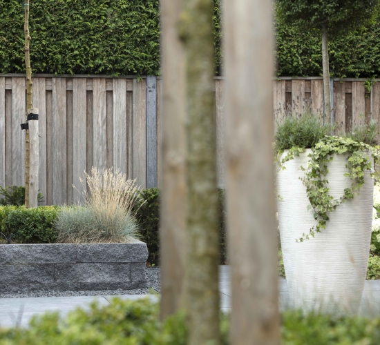 De kleuren van het basaltsplit en de stapelblokken komen overeen met de kleur van de terrastegels. Zo wordt er veel rust gecreëerd in de tuin en vormt het een samenhangend geheel. Deze kleurencombinatie zorgt voor een samenhangend geheel waardoor er in de tuin een verzorgde en rustige sfeer ontstaat.