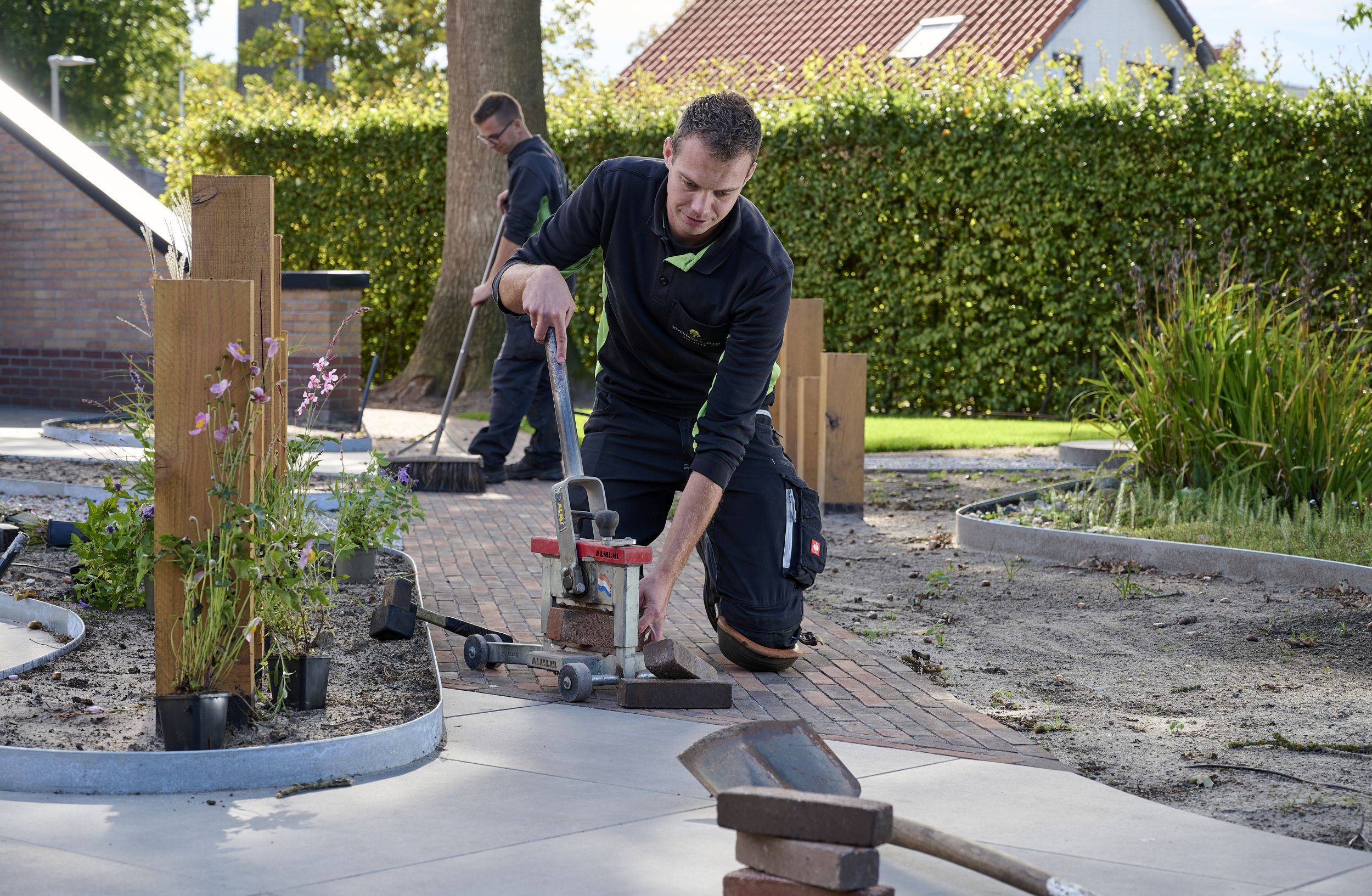 In het hart van ’t Harde, midden in een woonwijk ligt deze groene verborgen parel. De complete tuin is volledig gerenoveerd. Bijna alles is nieuw opgebouwd, maar de bestaande vijver en en twee karakteristieke eiken bleven behouden. Daarmee bleef ook een stukje historie overeind. De tuin kreeg een nieuw ontwerp met organische vormen en rondingen die perfect passen bij de omgeving van de Veluwe. Gebakken bestrating, keramische tegels en tuinmuren vormen samen de basis van het ontwerp.