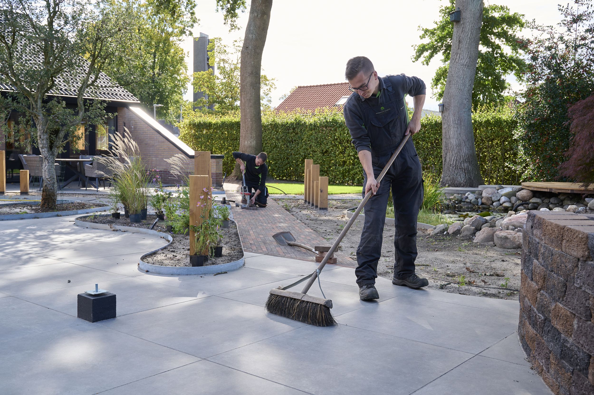 De tuin voelt als een groene oase midden in de woonwijk. Het ontwerp sluit aan op de bosrijke omgeving van de Veluwe en versterkt die natuurlijke uitstraling. Door te werken met groenblijvende hagen, kurkeiken en naaldbomen ontstaat een tuin die het hele jaar door een natuurlijke basis heeft. De beplanting trekt insecten en bijen aan en biedt beschutting voor vogels. Zo ontstaat een tuin die leeft, groeit en deel uitmaakt van de natuur om haar heen.